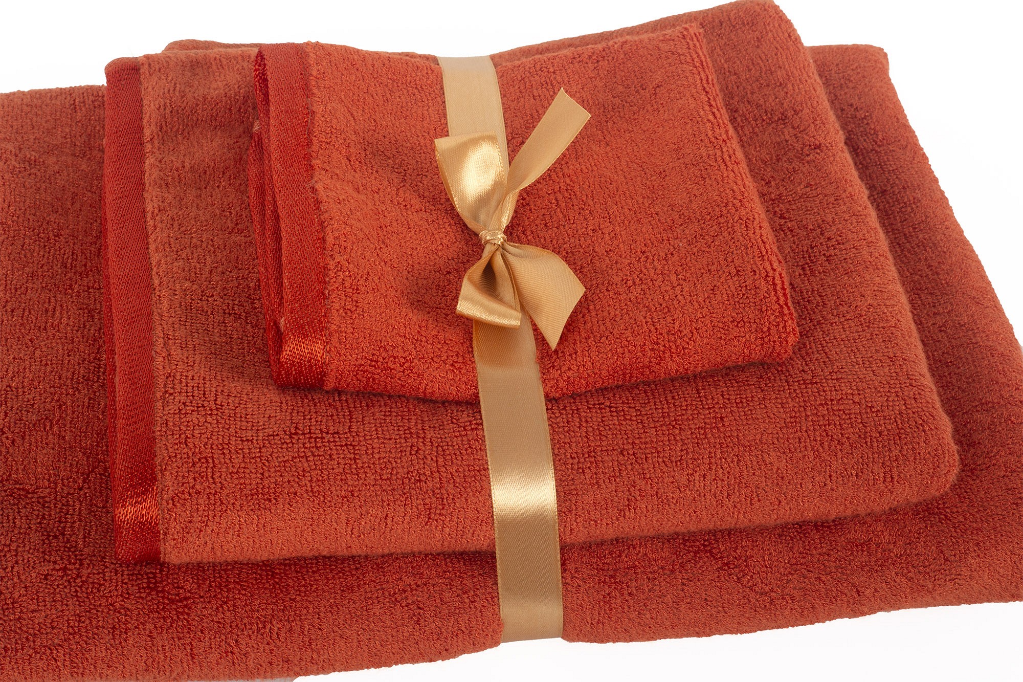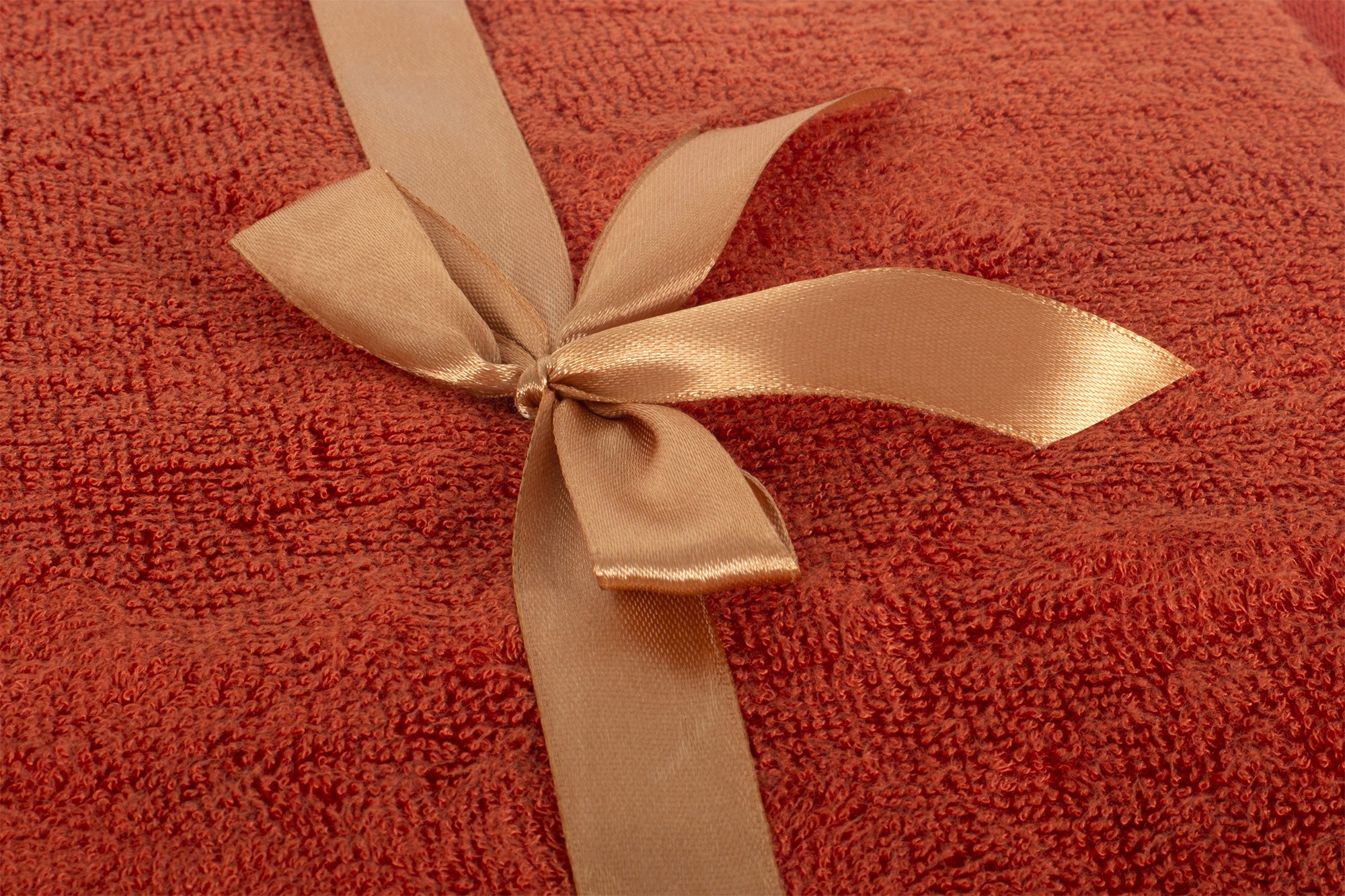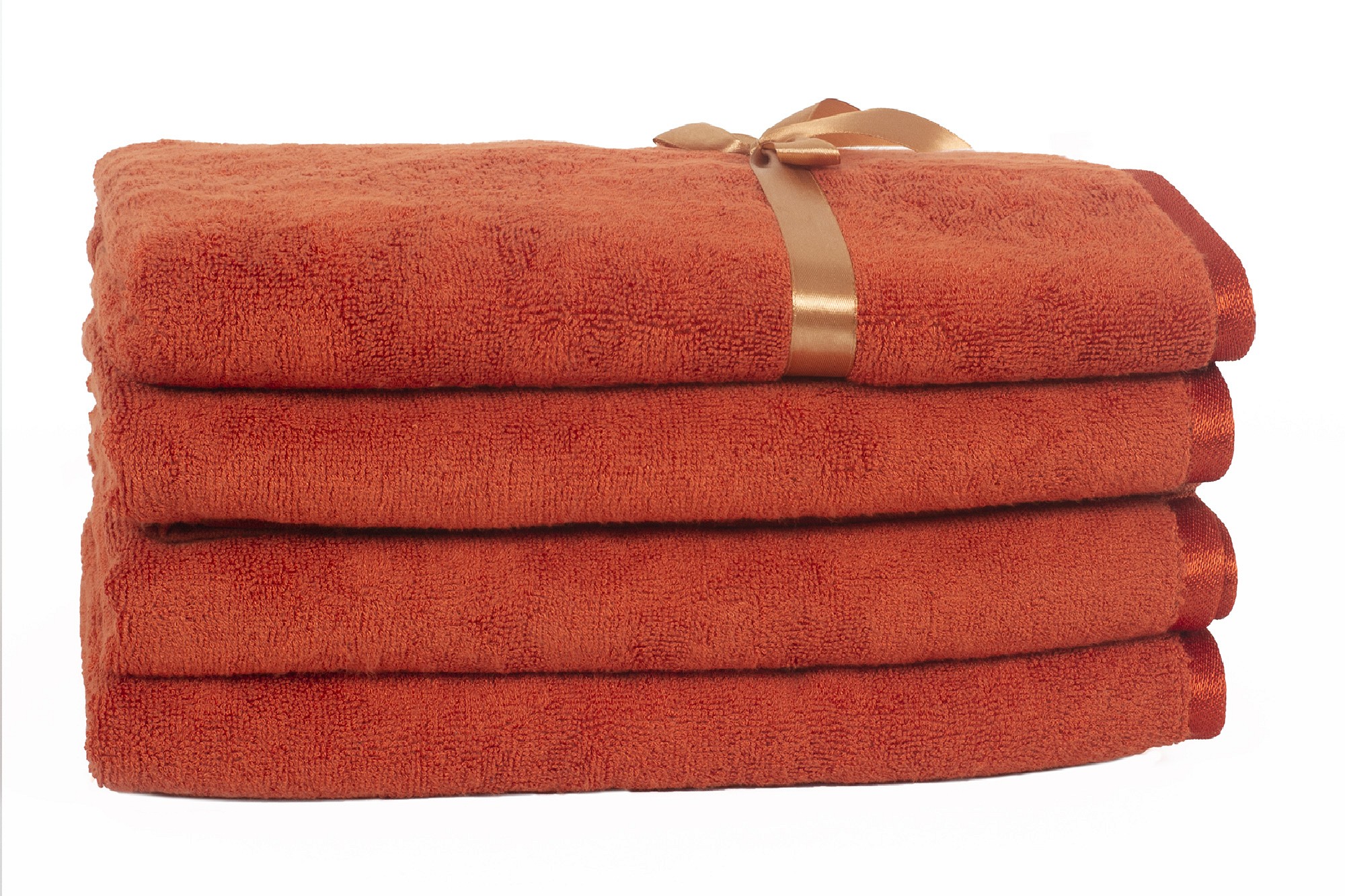Terakotově oranžový bambusový ručník s lesklou oranžovou lemovkou. Bambusové ručníky jsou velmi kvalitní, vysoce savé a rychleschnoucí. Ručníky a osušky jsou ovázány zdobnou mašlí.