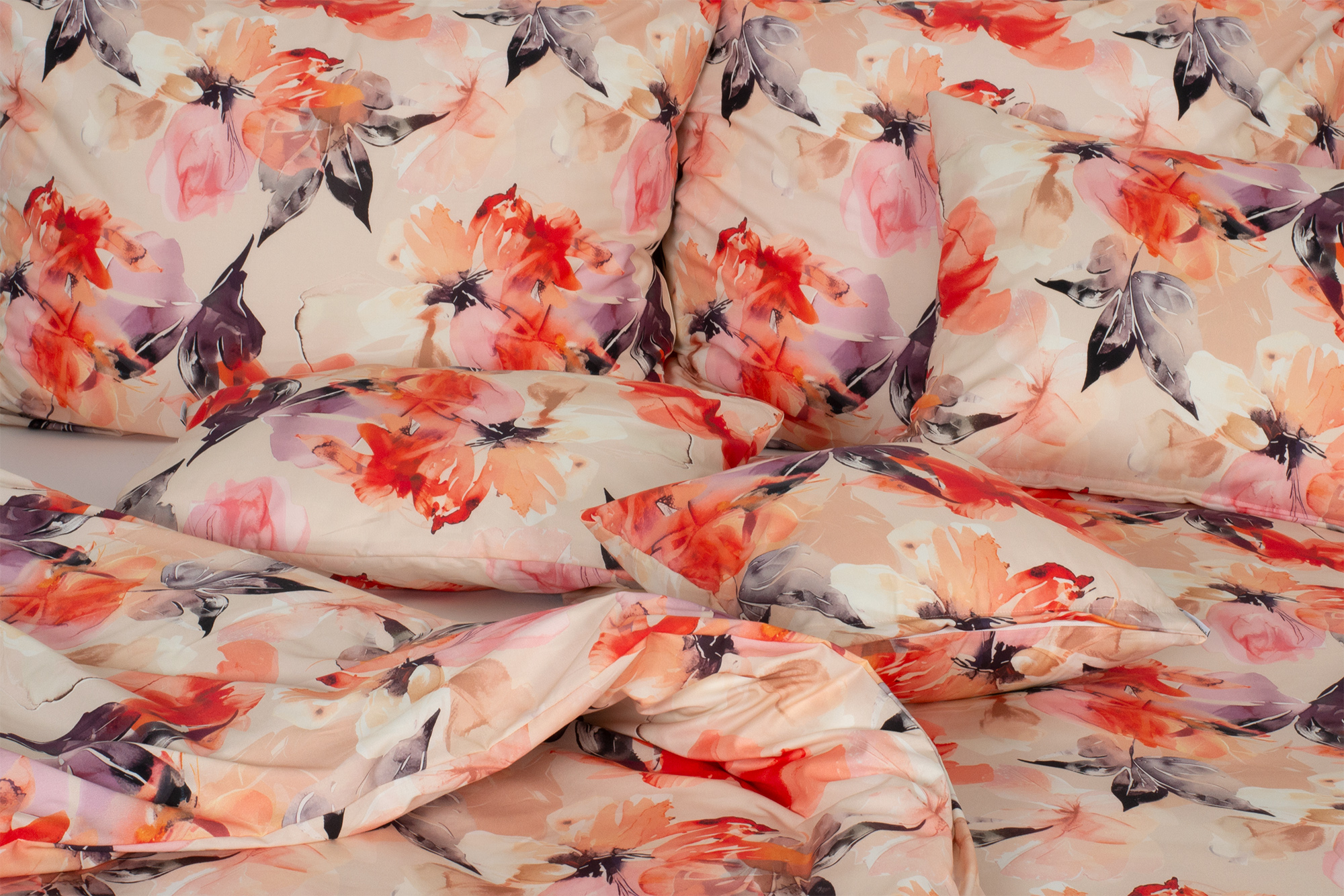 Květy s listy ve fialových, sytě červených, oranžových a béžových tónech se rotačně opakují na celé ploše povlečení.