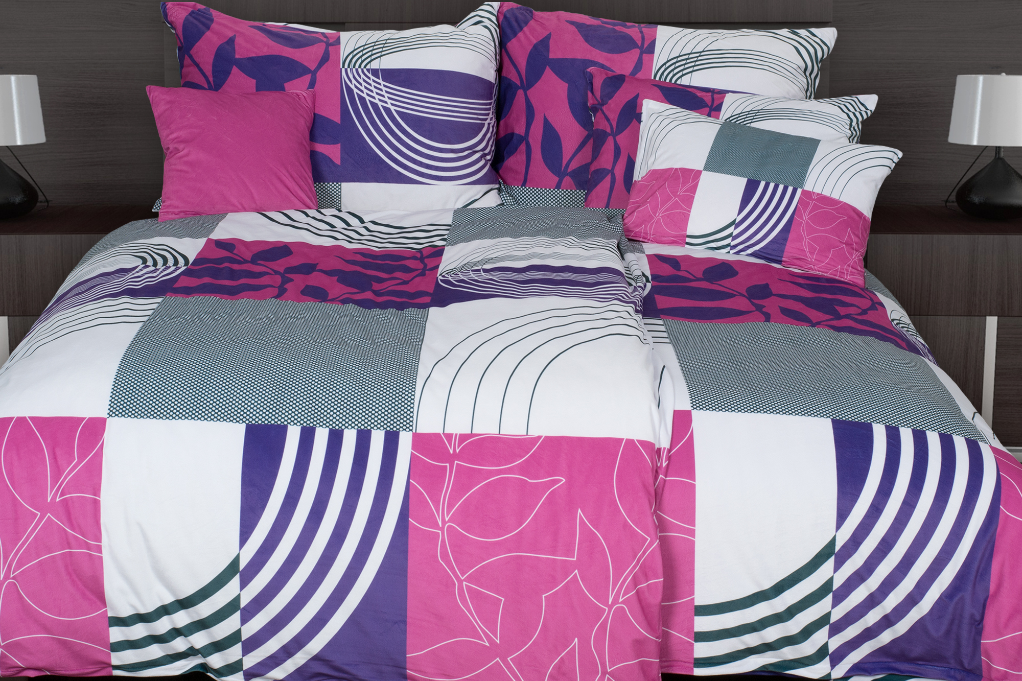 Čtverce s kruhy a oblouky, pruhy a lístky, střídání černé a bílé s dominantní fialovou barvou, takové je povlečení Ceasar.