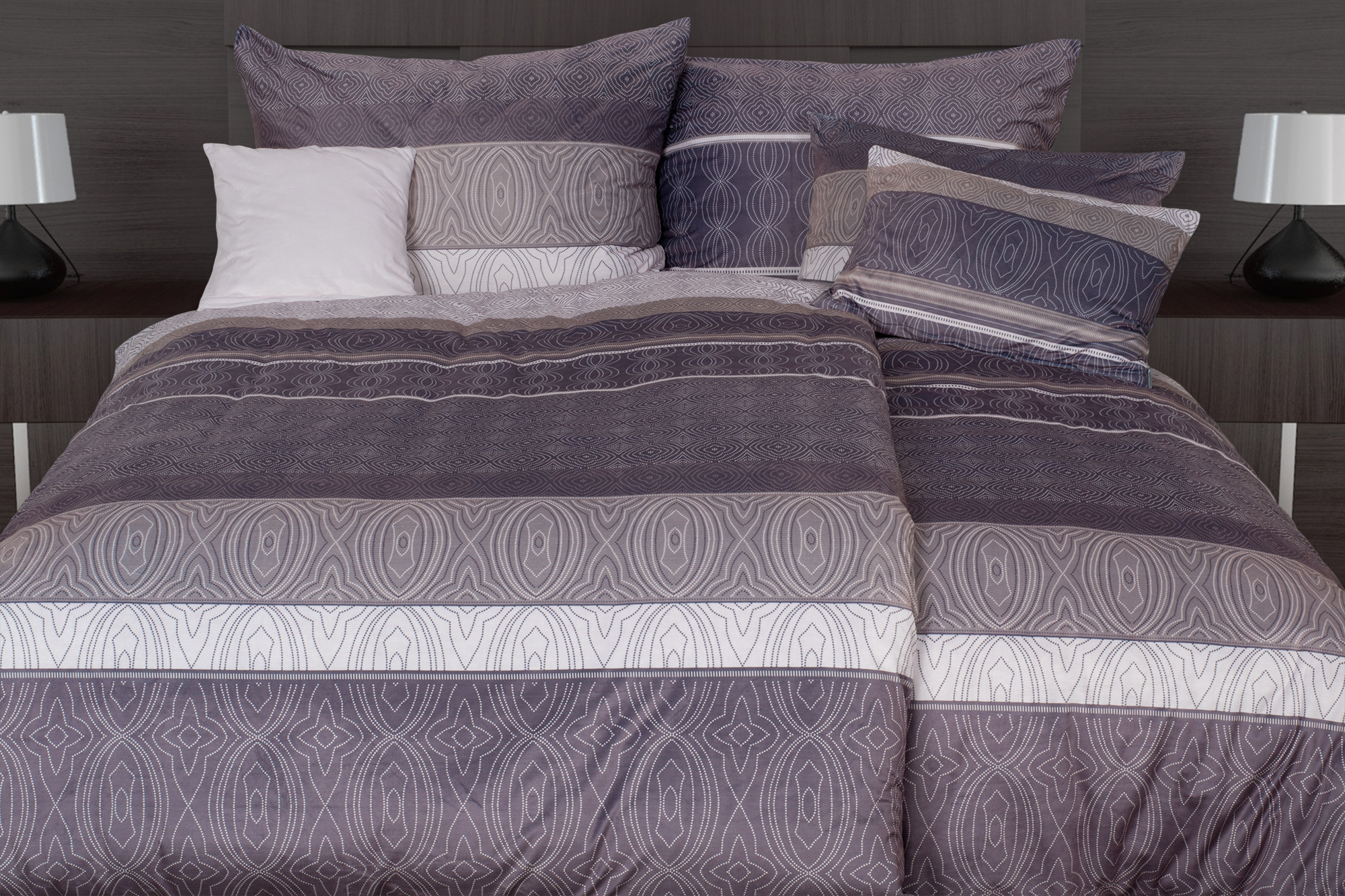 Povlečení znázorňuje kombinaci různých odstínů hnědé barvy s jemným geometrickými motivy, které jsou uspořádané do elegantních pruhů.