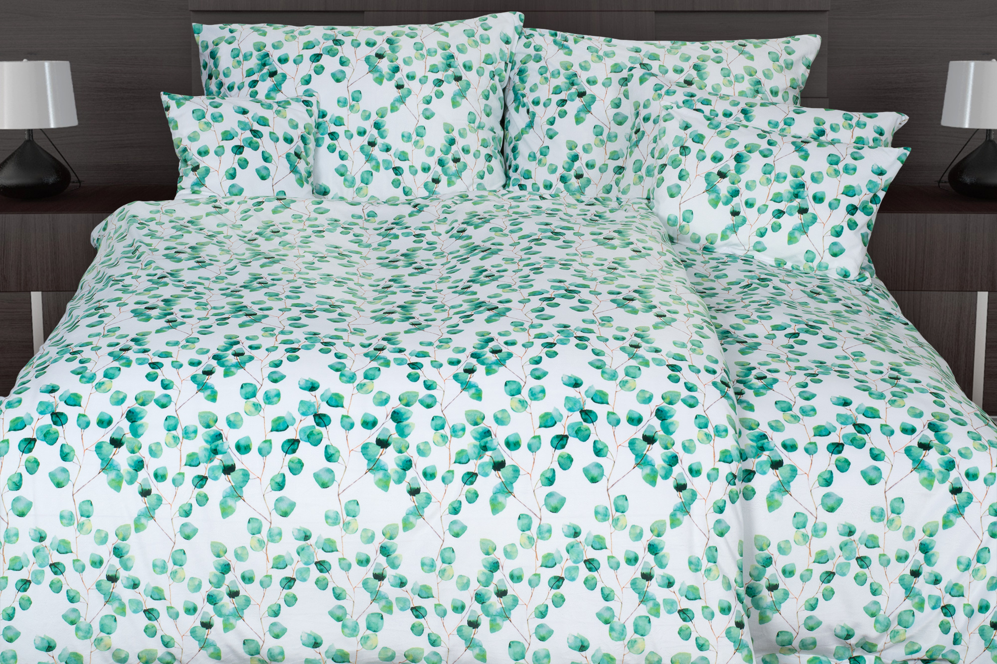 Téměř jako od malíře vystínované eukalyptové listy zaujímají celou bílou plochu tohoto nádherného povlečení.