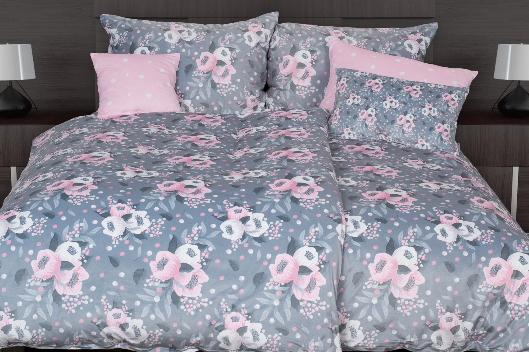 Na šedém podkladu vystupuje rotační vzor s kvítky na větvičkách. Povlečení je oboustranně stejné. Jemnost tohoto povlečení dotváří dekorační polštářky v pastelově růžovém tónu s bílými puntíky, popř. polštářky se stejným, graficky zmenšeným motivem.