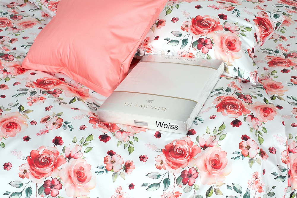 Květy růží jsou rozesety na bílém podkladu povlečení.