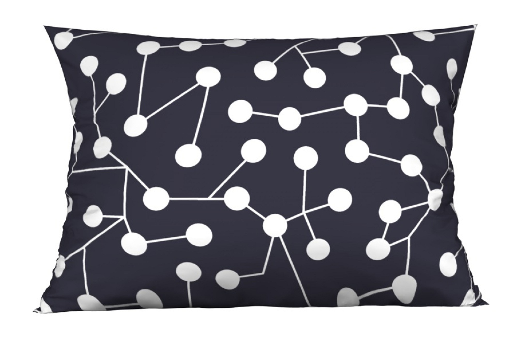 Černé polštáře jsou potištěny bílým geometrickým motivem, tentýž motiv je pak černě natištěný na bílém podkladě.