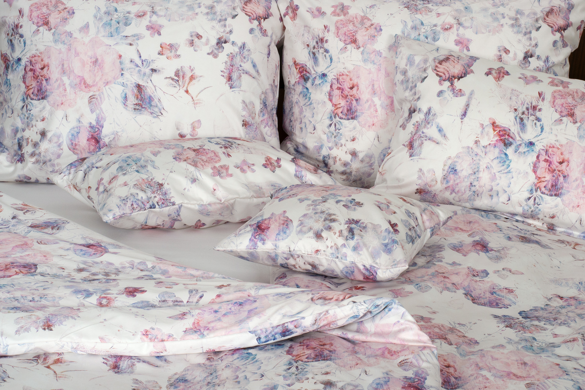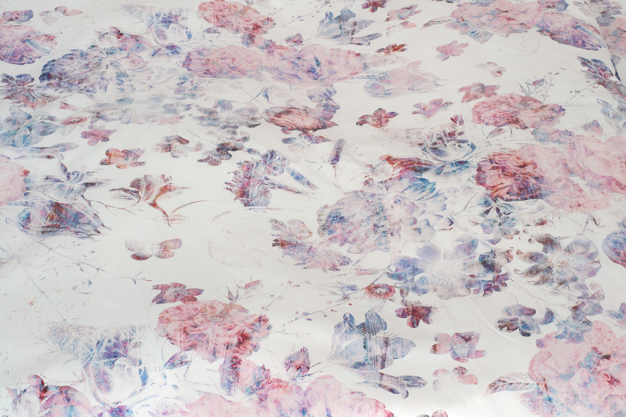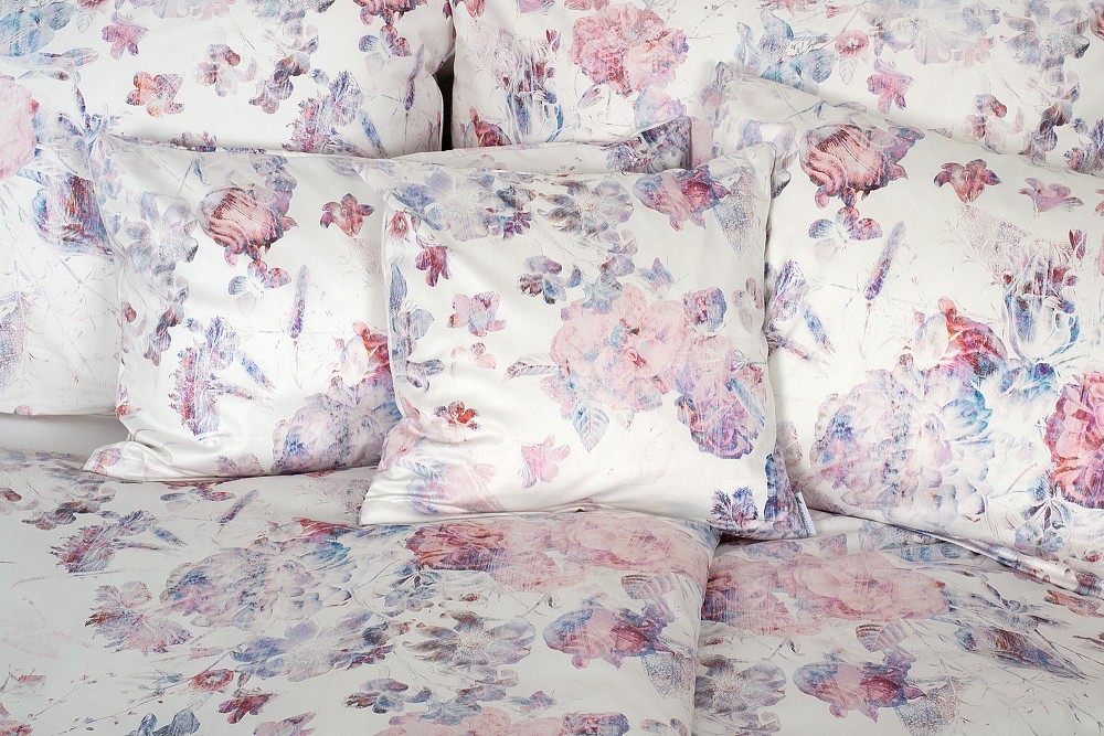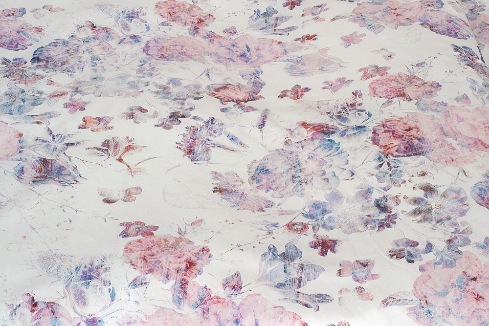 Na smetanově bílém podkladu je ztvárněný růžovofialový květinový motiv v tzv. vypraném efektu. Vzor tak působí netradičně a vynikne v každém stylu ložnice.