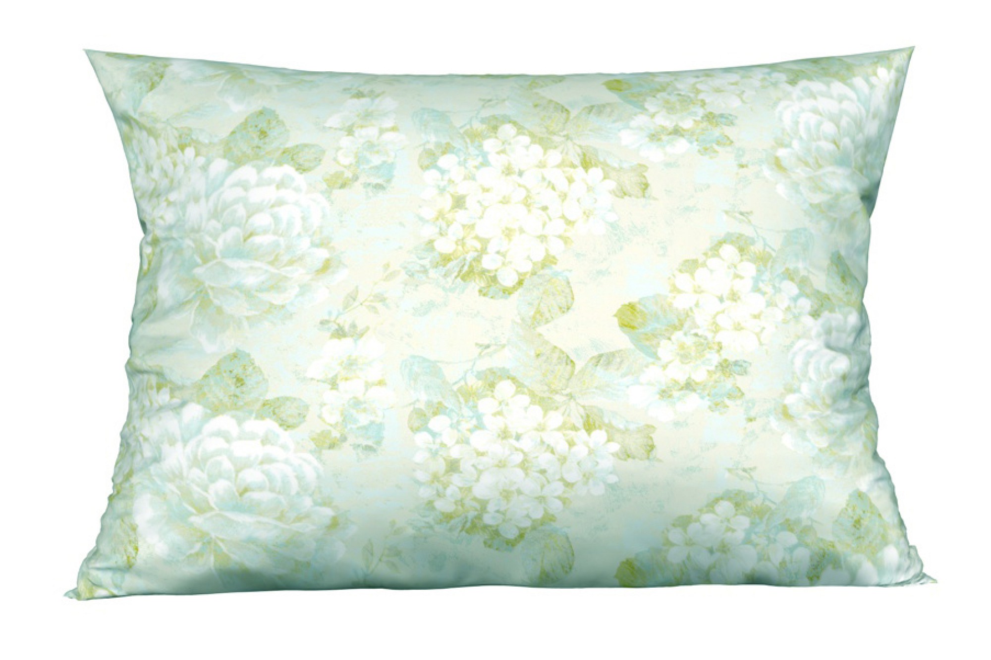 Na podkladu v barvě mint se po celé ploše povlečení rozprostírají květy hortenzie, které vypadají jakoby je namaloval sám slavný Monet.