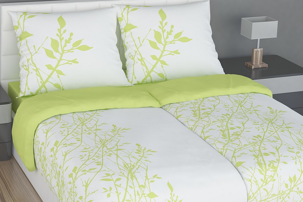 Světle zelené proplétající se větvičky zkrášlují bílé pozadí. Zadní strana povlečení je světle zelená.
