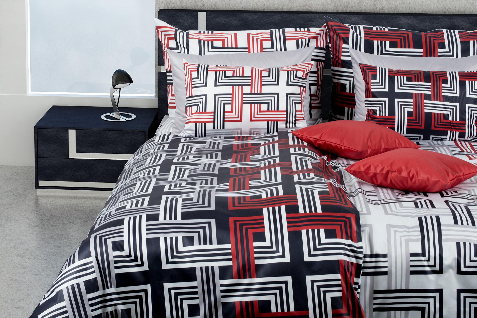 Na černobílém povlečení jsou v geometrických řadách a sloupcích provázané černobílé a červené čtverce.