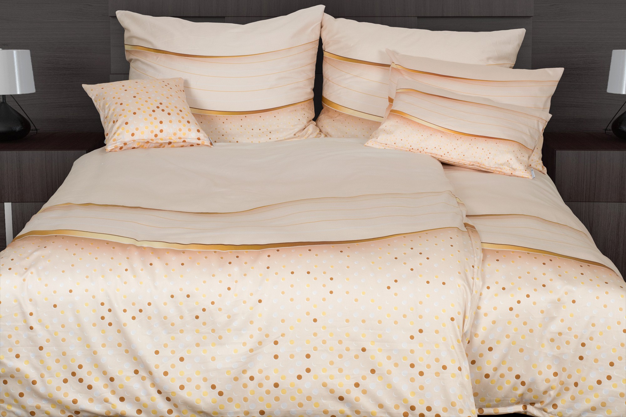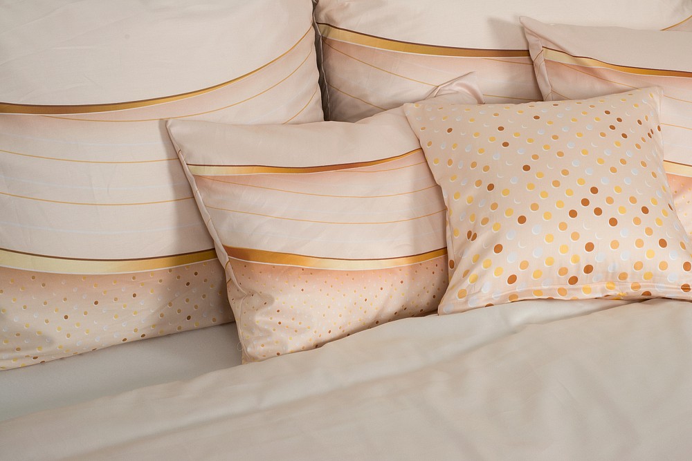 Béžovo-lososově zbarvený podklad povlečení Lotte zdobí puntíky a příčné pruhy v béžových tónech. Celkový dojem umocníte dekoračními polštárky sestávajícími z puntíků a graficky zmenšeného hlavního motivu povlečení. Easy-Care úprava je v dnešní době už nezbytností každého povlečení.