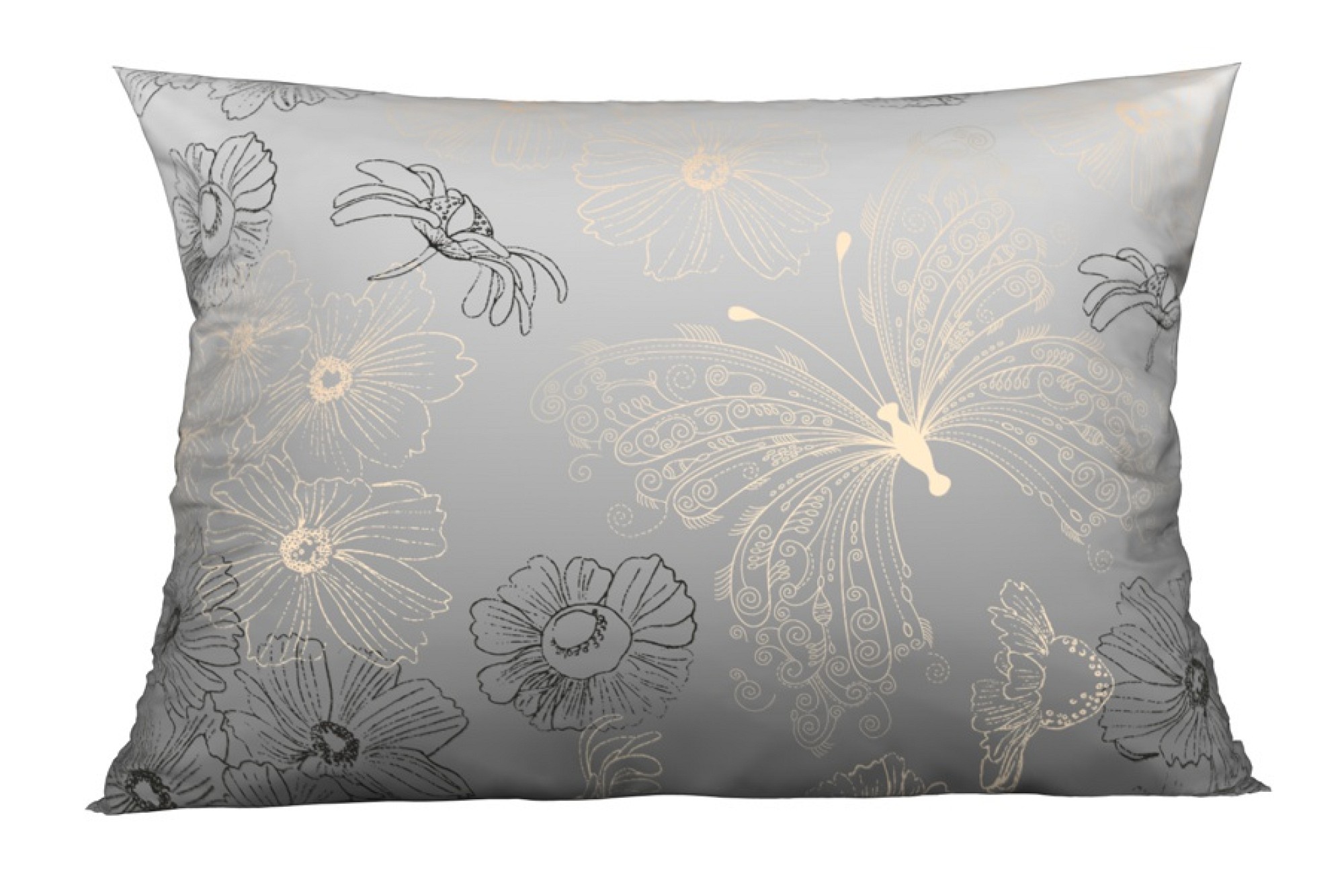 Velmi jemné a elegantní povlečení s béžovými motýly a tmavými květy na šedém podkladě.
