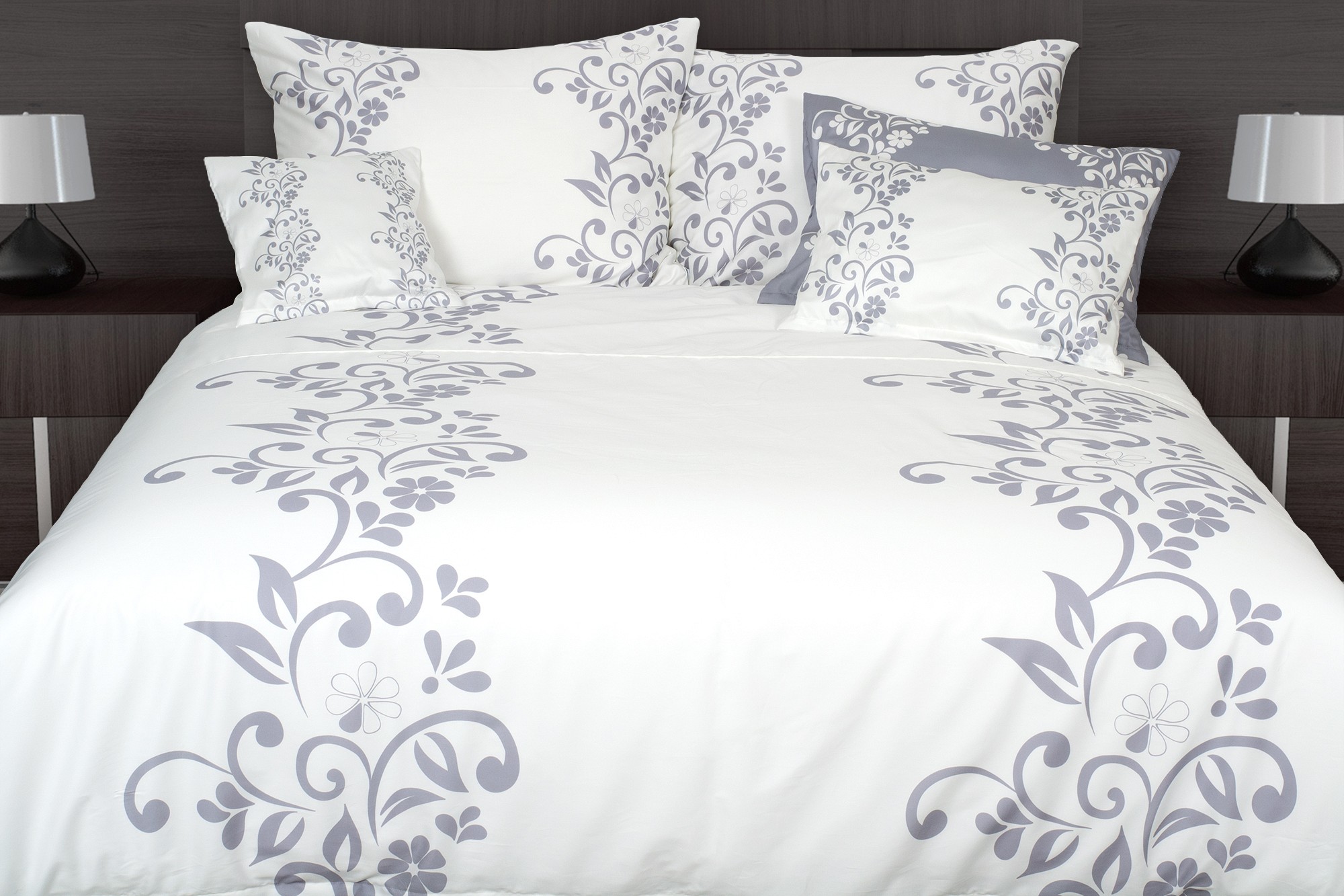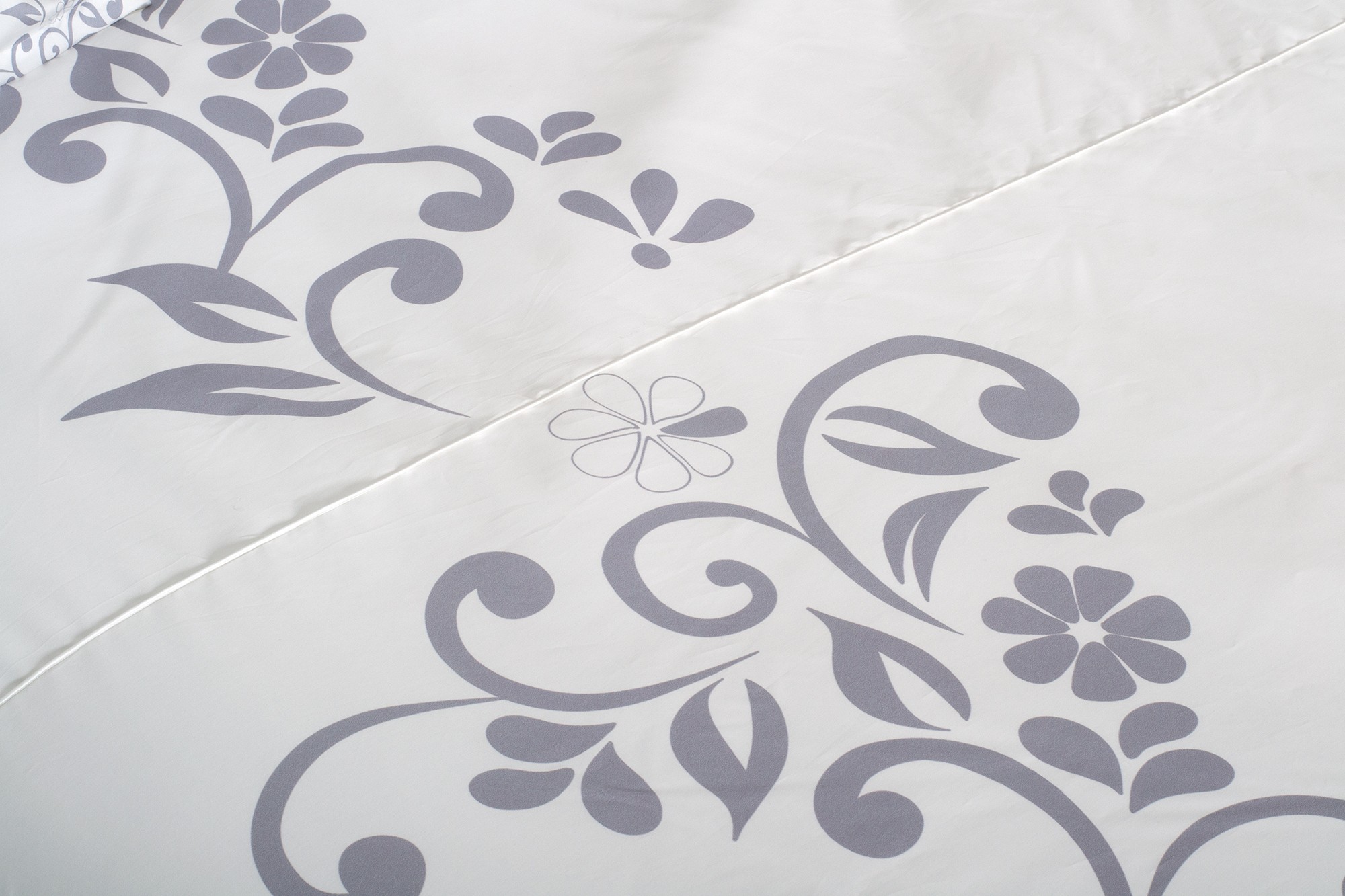 Zadní strana povlečení je v neutrální světle šedé barvě a je doplněna bílou přední stranou s květinovým ornamentem.