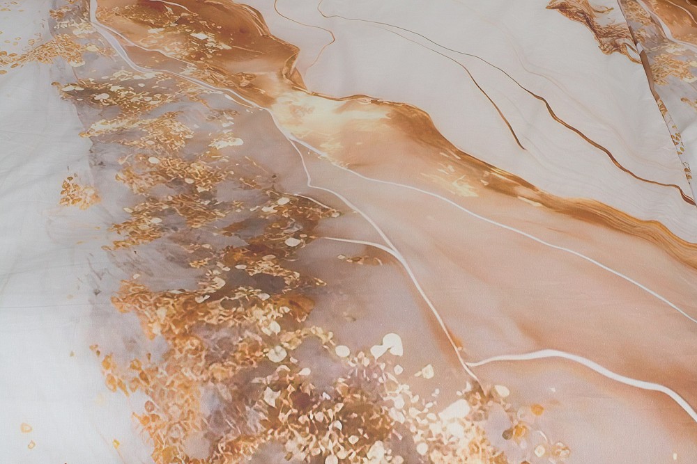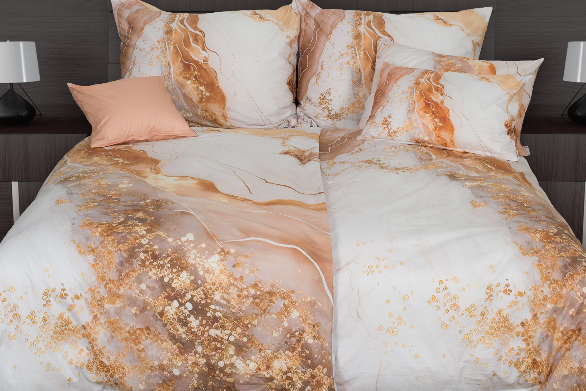 Luxusní barevná kombinace bílé a zlaté okouzlí nadčasovou elegancí a hřejivou atmosférou. Abstraktně pojatý vzor se skvěle hodí do každého stylu ložnice. Ucelený dojem povlečení dotváří dekorační polštářky.