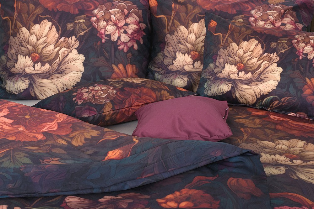 Vzor na tomto povlečení zaujme svou bohatostí a výrazným, téměř malířským zpracováním. Tmavý podklad v hlubokých odstínech modré, petrolejové a vínové vytváří elegantní základ, na kterém vynikají velké květinové motivy v teplých tónech.